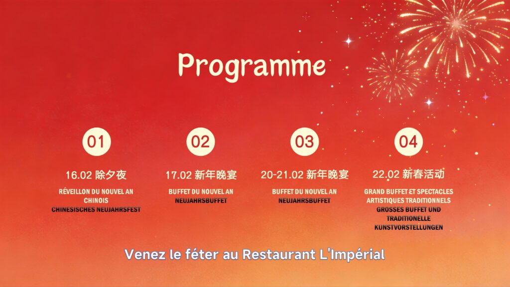 Le Restaurant Impérial est l’endroit idéal pour des repas en famille, entre amis ou pour des occasions spéciales. Profitez de notre cadre élégant et accueillant.